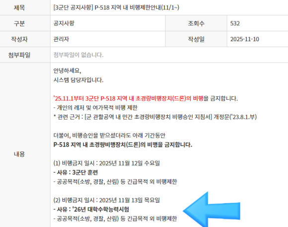 - 금지구역: 전국 모든 시험장 반경 3km 이내(수험장 주변, 특히 학교·체육관 등 시험 실시 장소 인근은 전면 비행금지 구역으로 설정됨)